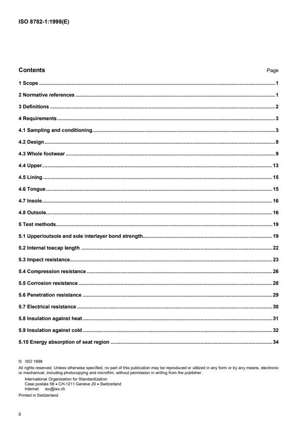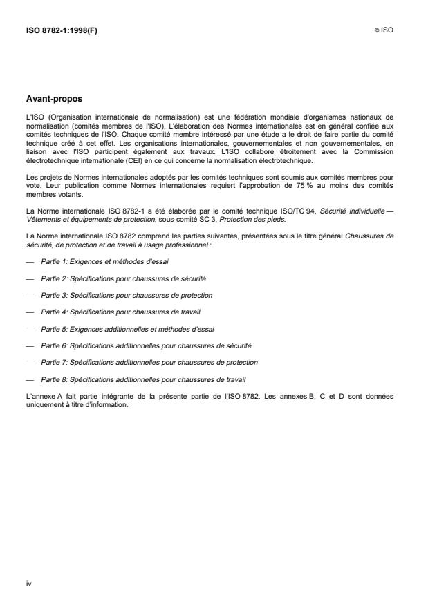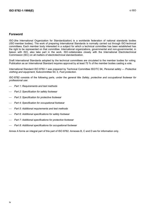 ISO 8782-1:1998 is a standard published by the International Organization for Standardization (ISO). Its full title is "Safety, protective and occupational footwear for professional use — Part 1: Requirements and test methods". This standard covers: Safety, protective and occupational footwear for professional use — Part 1: Requirements and test methods