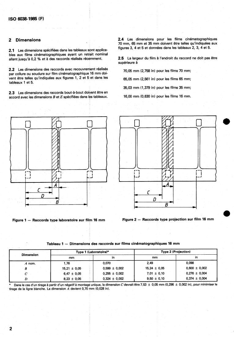 Tableau 2 - Dimensions des raccords sur films cinématographiques 35 mm