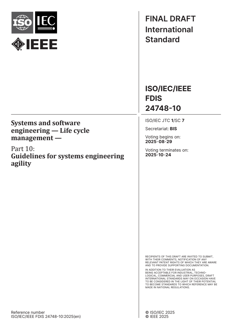 ISO/IEC/IEEE FDIS 24748-10 - Systems and software engineering — Life cycle management — Part 10: Guidelines for systems engineering agility Released:15. 08. 2025