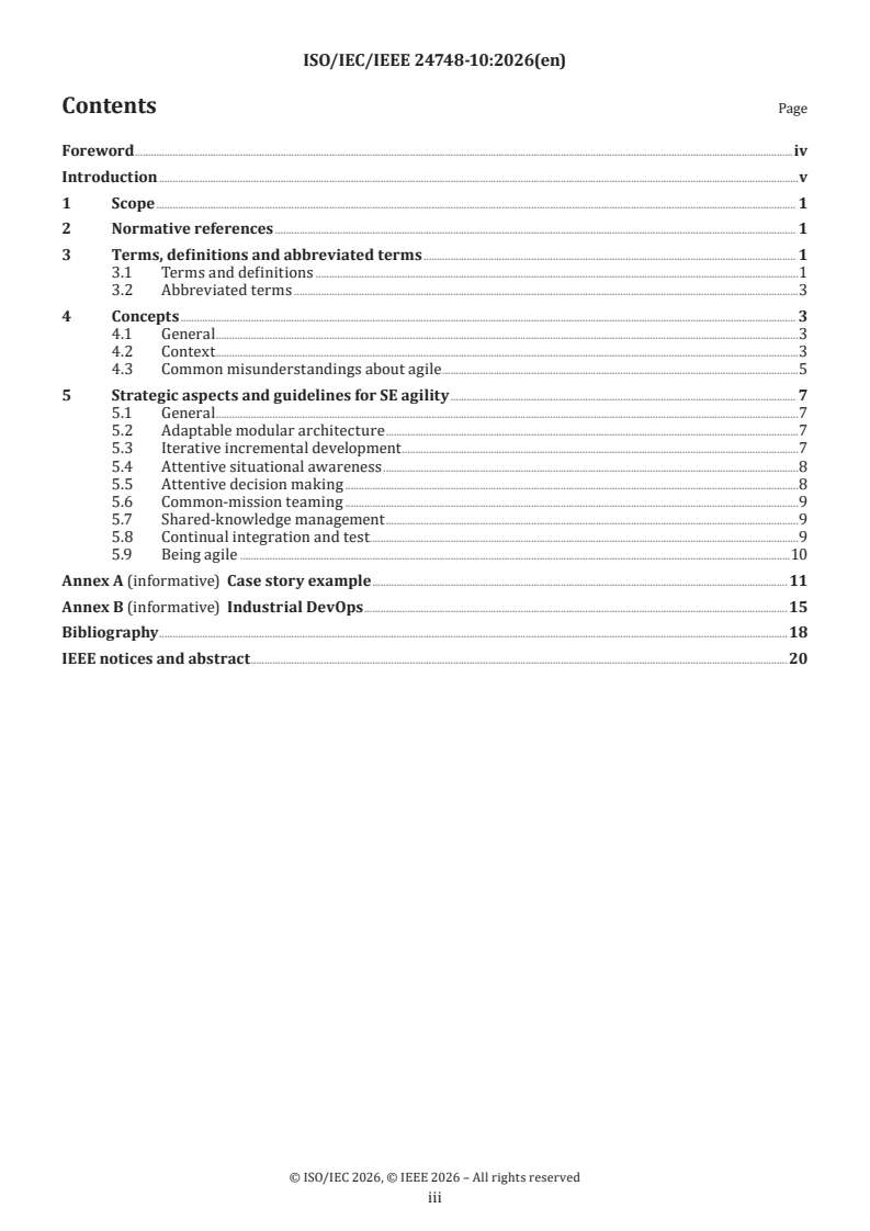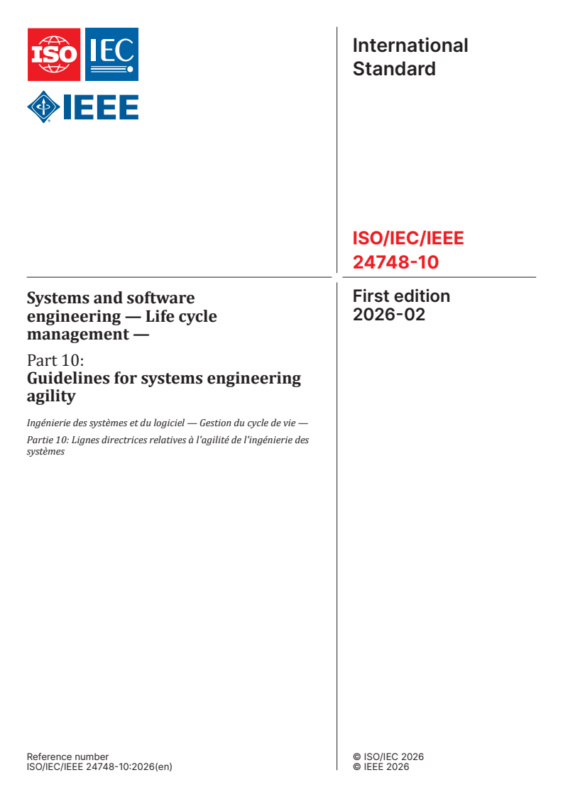 ISO/IEC/IEEE 24748-10:2026 is a standard published by the International Organization for Standardization (ISO). Its full title is "Systems and software engineering — Life cycle management — Part 10: Guidelines for systems engineering agility". This standard covers: This document: specifies strategic aspects supporting systems engineering agility; provides guidelines for their selection and application. This document is applicable to: those who use or plan to use ISO/IEC/IEEE 15288 on projects dealing with human-made systems and services related to those systems and products; those who are responsible for the technical management of projects concerned with the engineering of systems; those responsible for executing ISO/IEC/IEEE 15288 system life cycle processes at a project level; organizations and individuals who are seeking to improve their capability to deal with uncertain knowledge and dynamic environments.