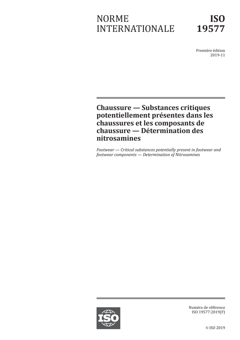 ISO 19577:2019 - Chaussure — Substances critiques potentiellement présentes dans les chaussures et les composants de chaussure — Détermination des nitrosamines/19/2019