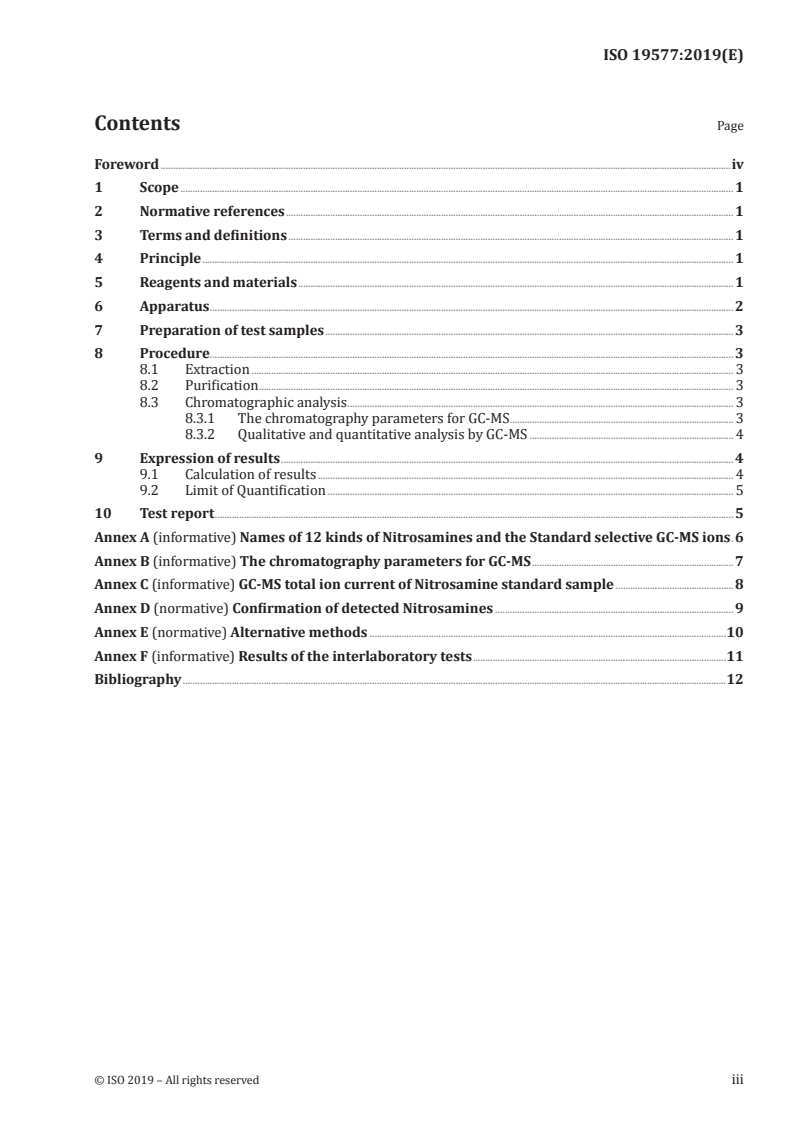 ISO 19577:2019 is a standard published by the International Organization for Standardization (ISO). Its full title is "Footwear — Critical substances potentially present in footwear and footwear components — Determination of Nitrosamines". This standard covers: This document specifies a method for the determination of the content of 12 kinds of Nitrosamines (see Annex A) in footwear and footwear components by using solvent extraction and Gas chromatography with mass selective detector (GC-MS). This document is applicable to rubber in footwear materials. NOTE ISO/TR 16178 defines which materials are concerned by this