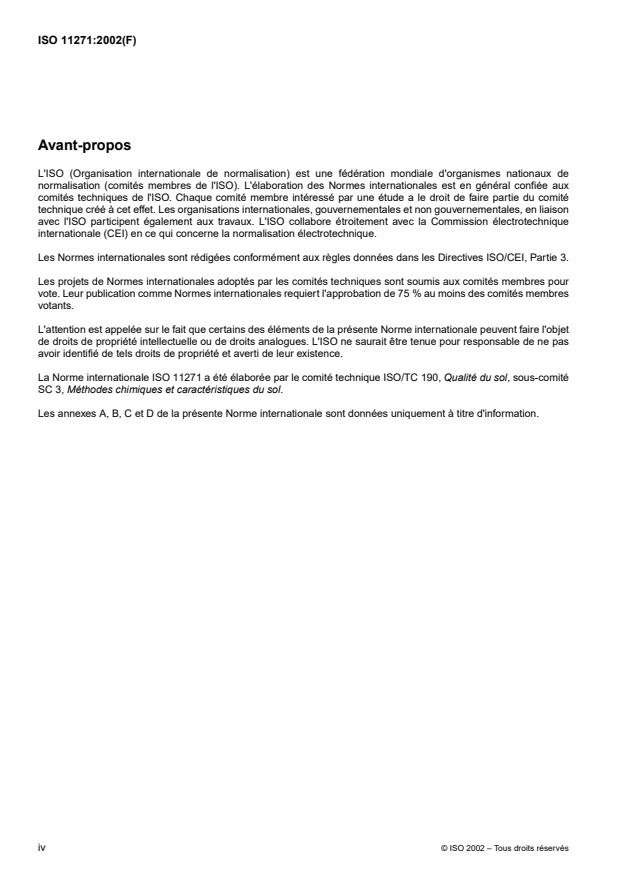 ISO 11271:2002 is a standard published by the International Organization for Standardization (ISO). Its full title is "Soil quality — Determination of redox potential — Field method". This standard covers: ISO 11271:2002 specifies a field method for the determination of soil redox potential (Eh). NOTE The electrochemical measurement of redox potential described here is possible only if the relevant soil horizon has a moisture status defined as fresh or wetter according to the classes presented in annex D.