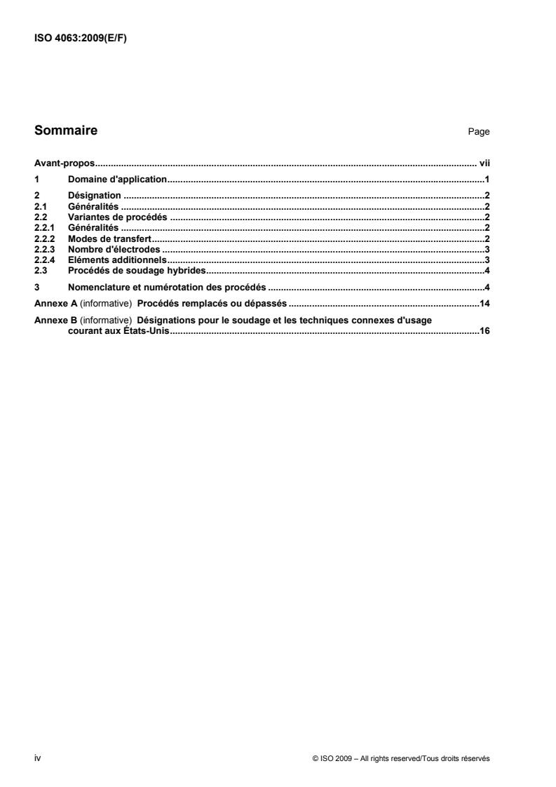 L'ISO 4063:2009 établit une nomenclature, avec des numéros de référence, pour les procédés de soudage et les techniques connexes; chaque procédé est identifié par un numéro de référence. L'ISO 4063:2009 couvre les groupes principaux de procédés (un chiffre), les groupes (deux chiffres) et les sous-groupes (trois chiffres). Le numéro de référence pour un procédé donné comporte au maximum trois chiffres. Ce système est prévu pour faciliter l'informatisation, les dessins et les documents de travail, les descriptifs de modes opératoires de soudage, etc.