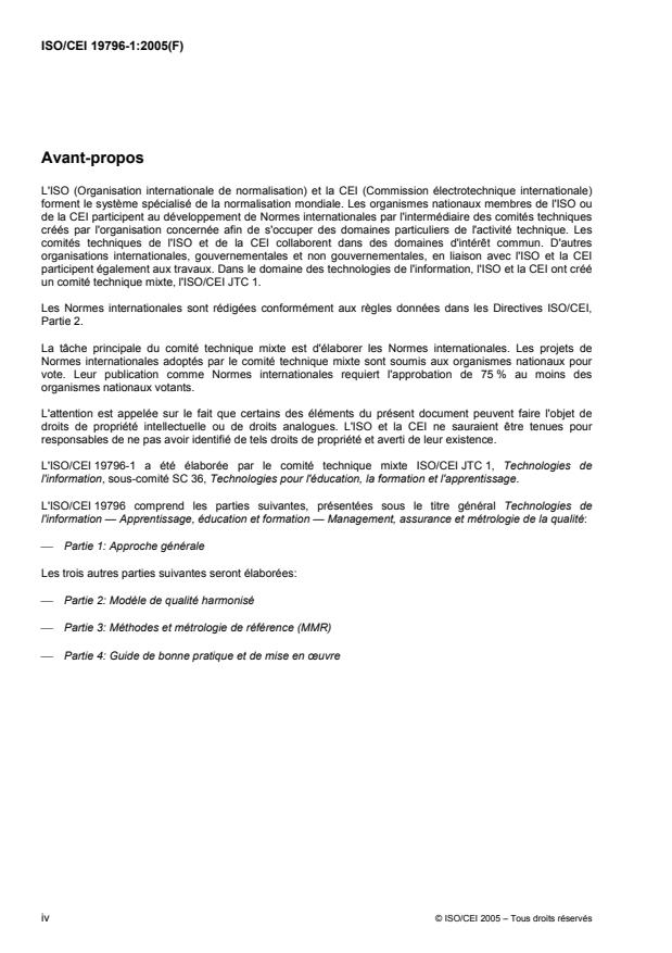 L'ISO/CEI 19796-1:2005 consiste en un cadre permettant de décrire, de comparer, d'analyser et de mettre en oeuvre les approches de management de la qualité et d'assurance de la qualité. Elle sert à comparer différentes approches existantes et à les harmoniser en tendant vers un modèle de qualité commun. L'aspect principal est le cadre de référence pour la description des approches qualité (RFDQ). L'ISO/CEI 19796-1:2005 comprend les points suivants: la description d'une approche qualité; le modèle du processus, définissant les processus fondamentaux à considérer lors du management de la qualité dans le domaine de l'apprentissage, de l'éducation et de la formation, basés sur les technologies de l'information et de la communication; la déclaration de conformité pour le format descriptif. Pour une meilleure compréhension de l'ISO/CEI 19796-1:2005, plusieurs annexes donnent des échantillons de son utilisation. Les annexes sont fondées sur le Référentiel français de bonne pratique d'apprentissage à distance (AFNOR Z 76-001) et sur le modèle allemand DIN PAS 1032-1. De plus, une annexe sur les critères de qualité de référence (RQC) est incluse. Ces critères servent de critères de référence pour l'analyse et l'évaluation des ressources et des scénarios d'apprentissage. Ces critères sont aussi non pas une approche de l'évaluation de la qualité elle-même, mais un cadre pour comparer différentes approches d'assurance de la qualité et d'évaluation de la qualité. En plus, il est montré plusieurs exemples d'utilisation, tels que des objectifs qualité spécifiques (par exemple la qualité des métadonnées) et des lignes directrices. L'ISO/CEI 19796-1:2005 n'est qu'un premier pas vers un cadre de qualité harmonisé; la prochaine étape est de définir les instruments et la métrologie de la qualité afin de fournir une approche complète de la qualité. Il est prévu de commencer le travail sur l'approche de la qualité totale en deuxième partie de l'activité d'assurance qualité.