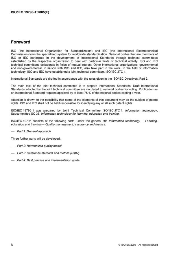 ISO/IEC 19796-1:2005 is a standard published by the International Organization for Standardization (ISO). Its full title is "Information technology — Learning, education and training — Quality management, assurance and metrics — Part 1: General approach". This standard covers: ISO/IEC 19796-1:2005 is a framework to describe, compare, analyse, and implement quality management and quality assurance approaches. It will serve to compare different existing approaches and to harmonize these towards a common quality model. The main aspect is the Reference Framework for the Description of Quality Approaches (RFDQ). ISO/IEC 19796-1:2005 consists of the following items: description scheme for quality management; process model defining the basic processes to be considered when managing quality in the field of ICT-supported learning, education, and training; conformance statement for the description format. For a better understanding of ISO/IEC 19796-1:2005, several annexes show samples of its use. The annexes are based on the French 'Code of Practice in e-Learning' (AFNOR Z 76-001) and German DIN PAS 1032-1. Additionally, an annex on Reference Quality Criteria (RQC) is included. These criteria serve as reference criteria for the analysis and evaluation of learning resources and scenarios. These criteria are also not a quality assessment approach itself, but a framework to compare different quality assurance and quality assessment approaches. Additionally, several examples of use are shown, such as specific quality objectives (e.g. metadata quality) and guidelines. ISO/IEC 19796-1:2005 is only the first step towards a harmonized quality framework; the next step is to define quality instruments and metrics in order to provide a complete quality approach. It is planned to begin the work on the full quality approach as the second part of the QA activity.