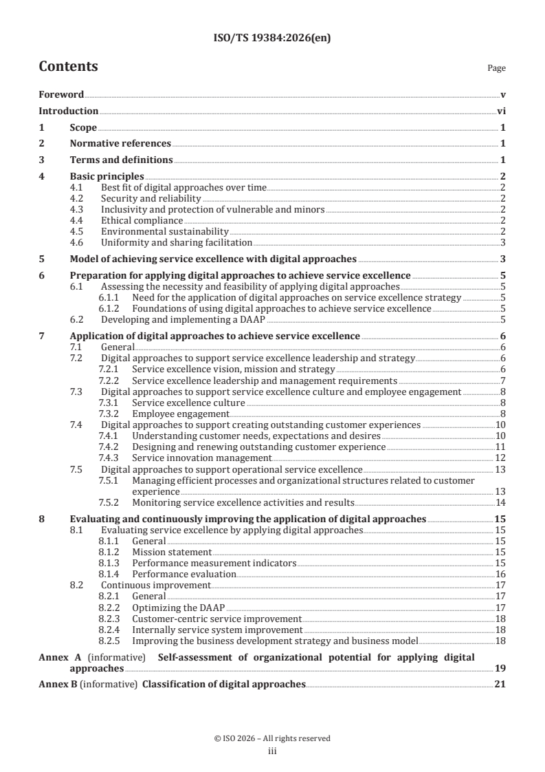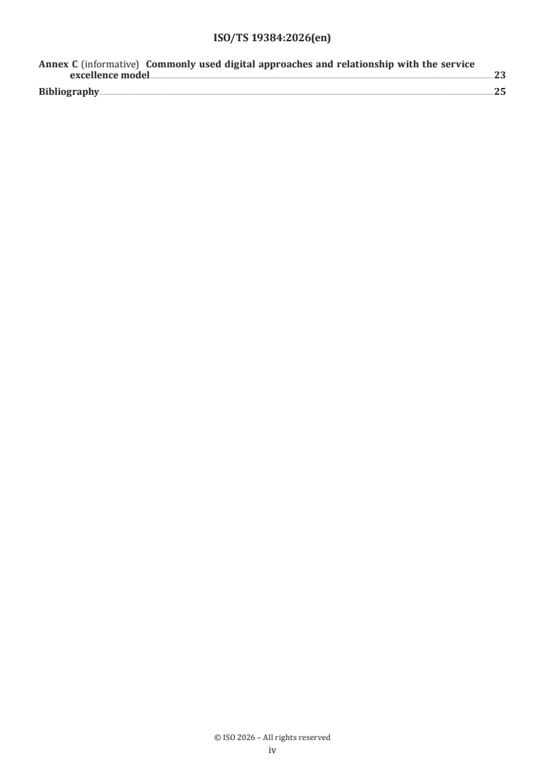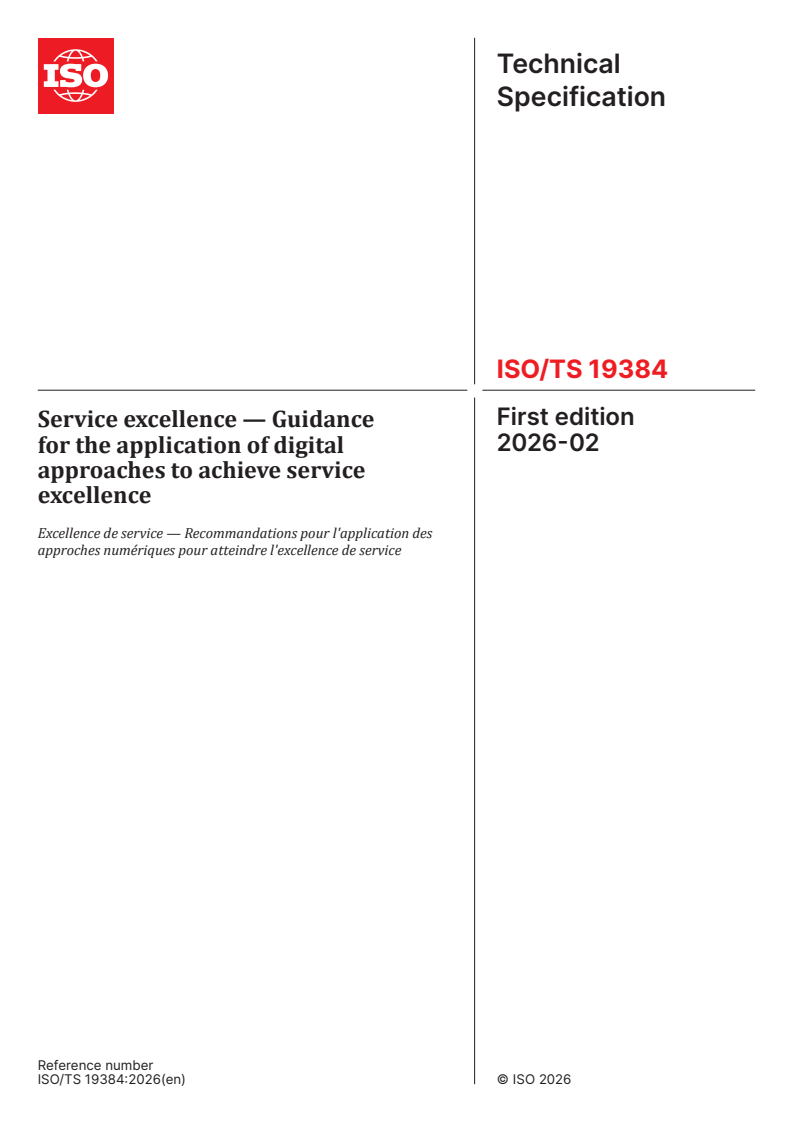 ISO/TS 19384:2026 is a technical specification published by the International Organization for Standardization (ISO). Its full title is "Service excellence — Guidance for the application of digital approaches to achieve service excellence". This standard covers: This document gives guidance on applying ISO 23592, including principles, models and specific application methods, to achieve service excellence by implementing and using digital approaches. This document is applicable to organizations having, or planning to have, digital approaches to achieve service excellence.
