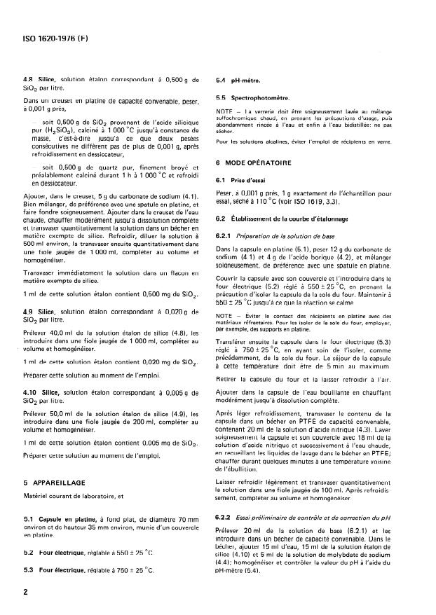 ISO 1620:1976 specifies a reduced molybdosilicate spectrophotometric method for the determination of silica (SiO2) in natural and artificial cryolite and in materials with a NaF/AlF3 molar ratio of about 3 to 1.7. The method is intended for products with phosphorus pentoxide (P2O5) ≤ 0.02% (m/m) and is widely used in laboratories supporting aluminium and fluorochemical production.