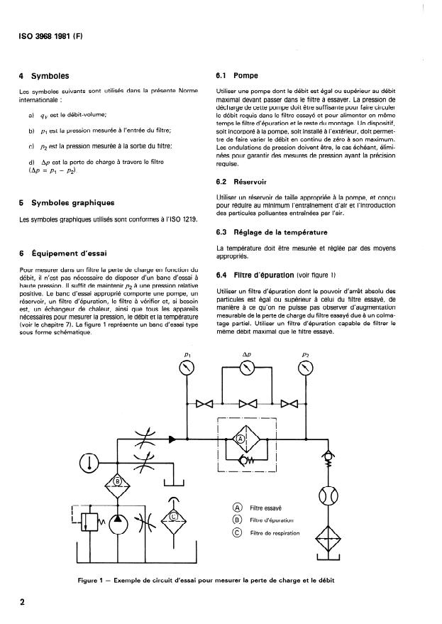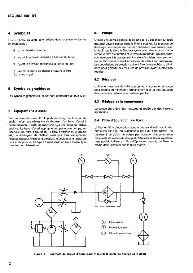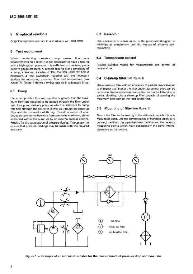 ISO 3968:1981 is a standard published by the International Organization for Standardization (ISO). Its full title is "Hydraulic fluid power — Filters — Evaluation of pressure drop versus flow characteristics". This standard covers: Specifies the method of measuring the pressure drop across a fluid filter under various conditions of flow. Two standards of measurement are specified: class A - for accurate evaluation for referee purposes - requiring laboratory conditions; class B - for evaluation for general purposes - requiring test facilities less stringent that laboratory conditions. Figure 1 shows an example for a suitable test circuit, and the typical reporting method is given in the table.
