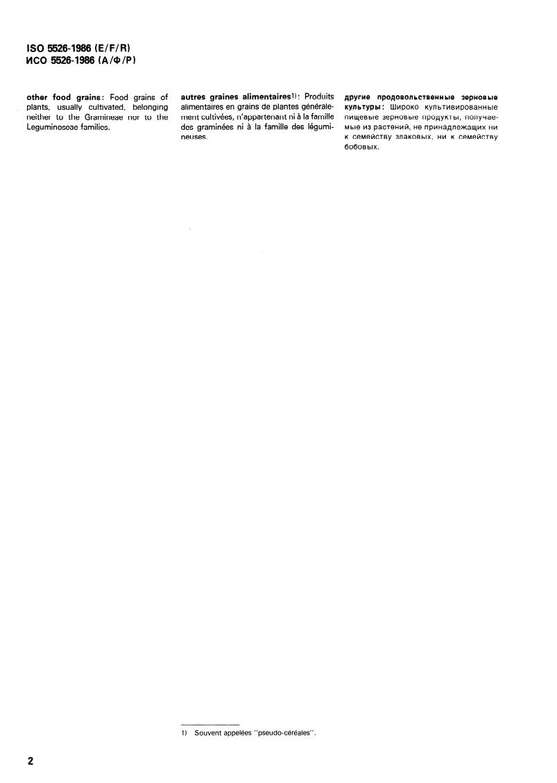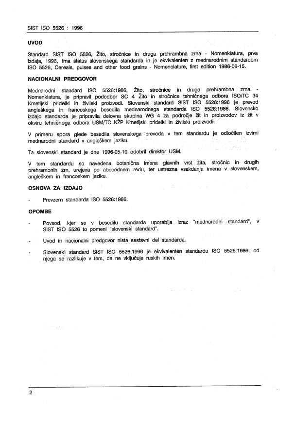 ISO 5526:1986 is a standard published by the International Organization for Standardization (ISO). Its full title is "Cereals, pulses and other food grains — Nomenclature". This standard covers: Lists the botonical names of 59 main species. It also lists their common names in English, French and Russian. The common names are listed alphabetically in the index. 21 most commonly met synonyms of the botanical names are indicated in an annex.