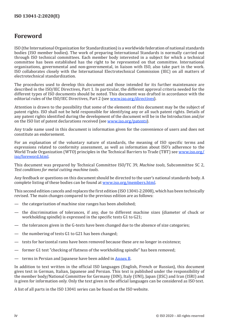 ISO 13041-2:2020 is a standard published by the International Organization for Standardization (ISO). Its full title is "Test conditions for numerically controlled turning machines and turning centres - Part 2: Geometric tests for machines with a vertical workholding spindle". This standard covers: This document specifies, with reference to ISO 230‑1 and ISO 230‑7, the geometric tests for general-purpose normal accuracy numerically controlled (NC) turning machines and turning centres with vertical workholding spindles, as well as the corresponding applicable tolerances. This document explains different concepts or configurations and common features of NC turning machines and turning centres with vertical workholding spindles. It also provides a terminology and designation of controlled axes (see Figures 1, 2 and Table 1). This document deals only with the verification of the accuracy of the machine. It does not apply to the operational testing of the machine (e.g. vibration, abnormal noise, stick slip motion of components) nor to machine characteristics (e.g. speeds, feeds). Tests not concerning the geometric accuracy of the machine are dealt with in other parts of ISO 13041.