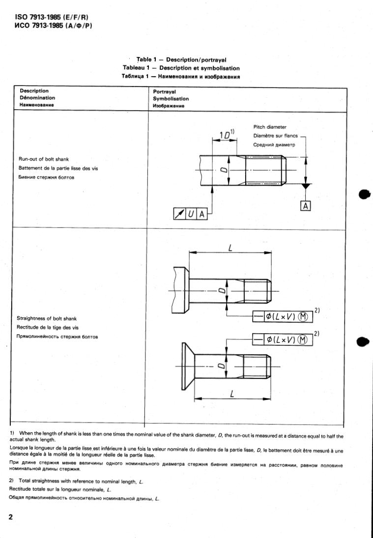 ISO 7913:1985 is a standard published by the International Organization for Standardization (ISO). Its full title is "Aerospace — Fasteners — Tolerances of form and position for bolts and screws". This standard covers: Aerospace — Fasteners — Tolerances of form and position for bolts and screws