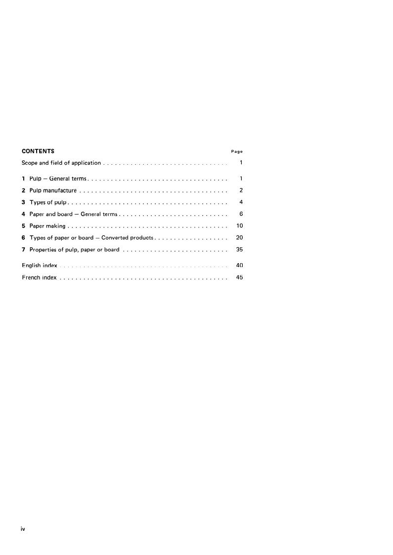 Includes the sections Pulp - Genenral Terms, Pulp Manufacture, Types of Pulp, Paper and Board - General Terms, Paper Marking, Types of Paper and Board - Converted Products, Properties of Pulp, Paper or Board, and has French and English indexes attached to it.