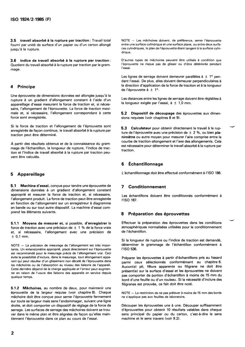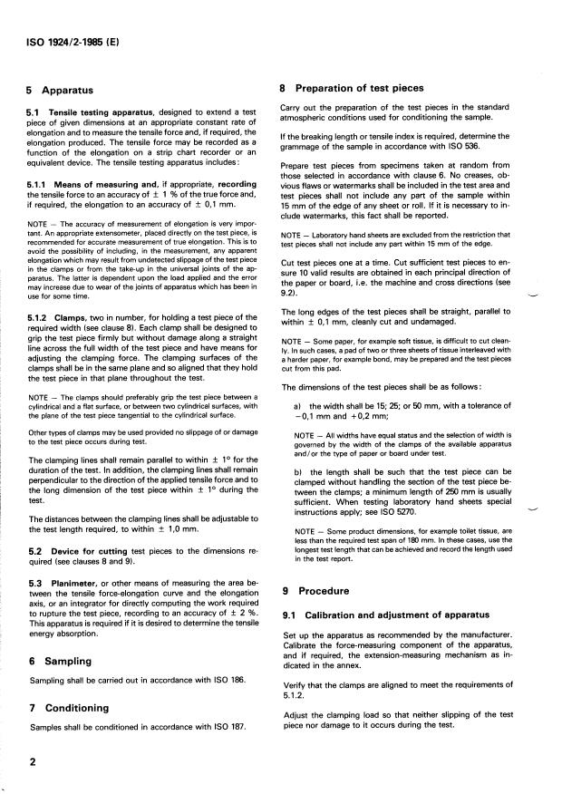 ISO 1924-2:1985 is a standard published by the International Organization for Standardization (ISO). Its full title is "Paper and board — Determination of tensile properties — Part 2: Constant rate of elongation method". This standard covers: Paper and board — Determination of tensile properties — Part 2: Constant rate of elongation method