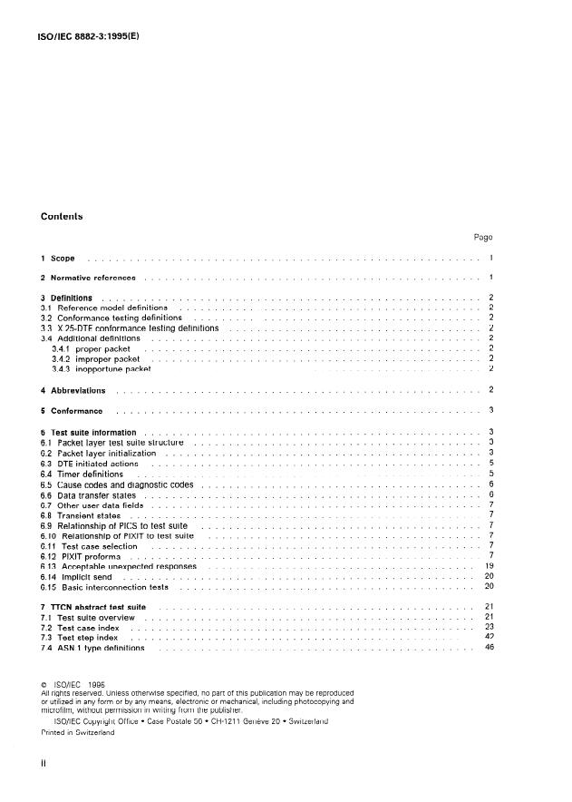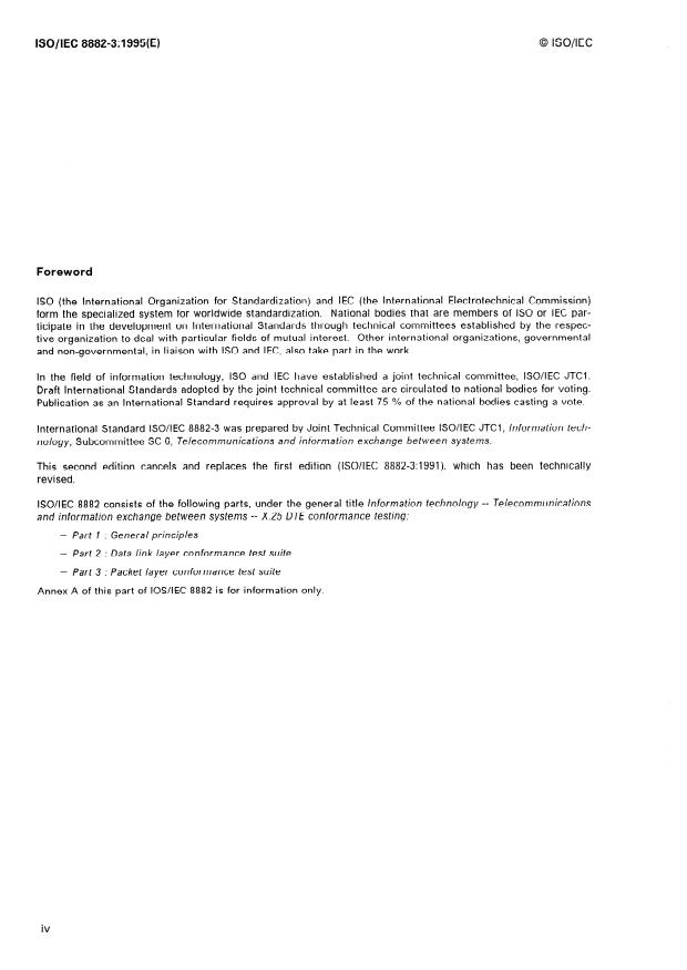 ISO/IEC 8882-3:1995 is a standard published by the International Organization for Standardization (ISO). Its full title is "Information technology — Telecommunications and information exchange between systems — X.25 DTE conformance testing — Part 3: Packet layer conformance test suite". This standard covers: Information technology — Telecommunications and information exchange between systems — X.25 DTE conformance testing — Part 3: Packet layer conformance test suite