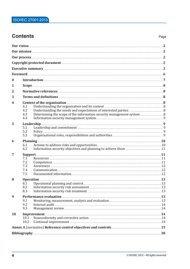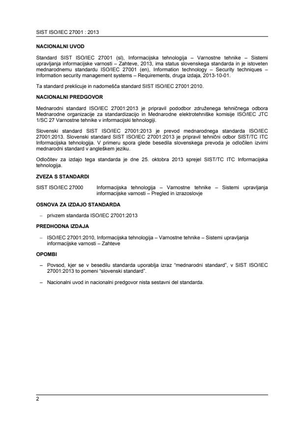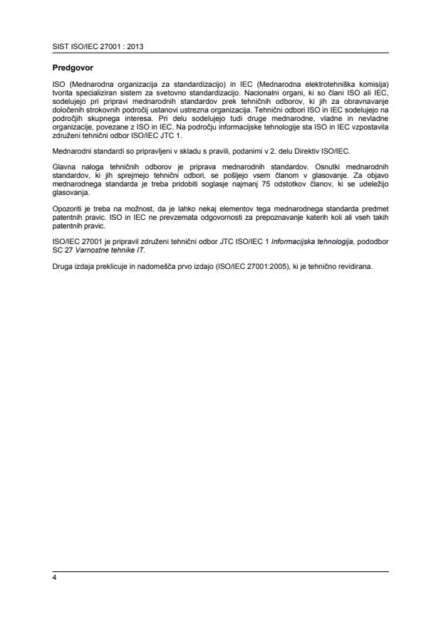 Ta mednarodni standard določa zahteve za vzpostavitev, izvajanje, vzdrževanje in nenehno izboljševanje sistema upravljanja informacijske varnosti v okviru organizacije. Ta mednarodni standard zajema tudi zahteve za ocenjevanje in obravnavanje tveganj informacijske varnosti, ki so prilagojene potrebam organizacije. Zahteve, postavljene v tem mednarodnem standardu, so generične in so namenjene uporabi v vseh organizacijah ne glede na vrsto, velikost ali naravo. Izključevanje katere koli zahteve, določene v točkah 4 do 10, ni sprejemljivo, kadar organizacija zagotavlja skladnost s tem mednarodnim standardom.