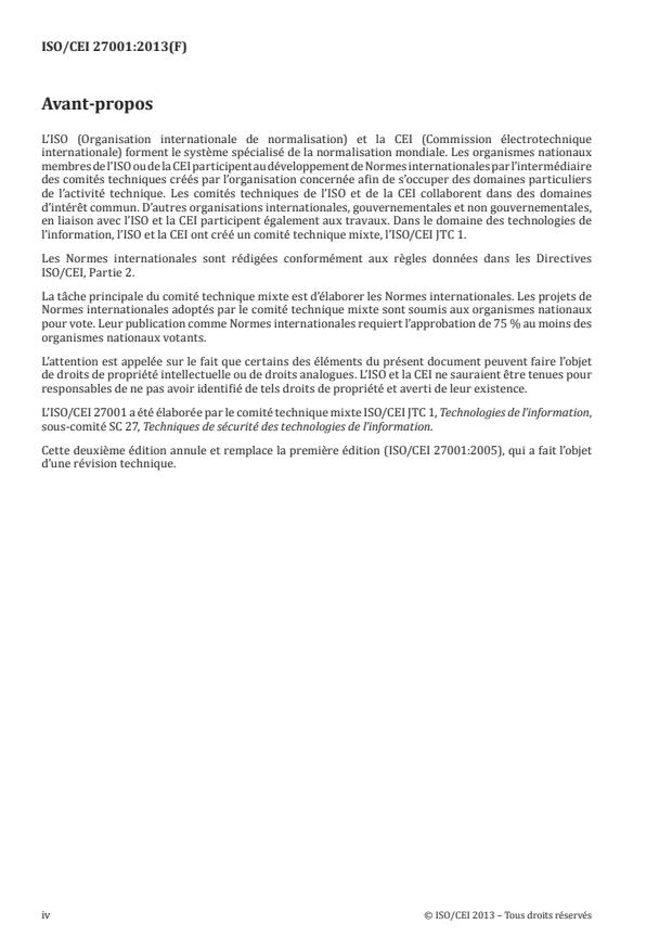 L'ISO/CEI 27001:2013 spécifie les exigences relatives à l'établissement, à la mise en œuvre, à la mise à jour et à l'amélioration continue d'un système de management de la sécurité de l'information dans le contexte d'une organisation. Elle comporte également des exigences sur l'appréciation et le traitement des risques de sécurité de l'information, adaptées aux besoins de l'organisation. Les exigences fixées dans l'ISO/CEI 27001:2013 sont génériques et prévues pour s'appliquer à toute organisation, quels que soient son type, sa taille et sa nature. Il n'est pas admis qu'une organisation s'affranchisse de l'une des exigences spécifiées aux Articles 4 à 10 lorsqu'elle revendique la conformité à l'ISO/CEI 27001:2013.