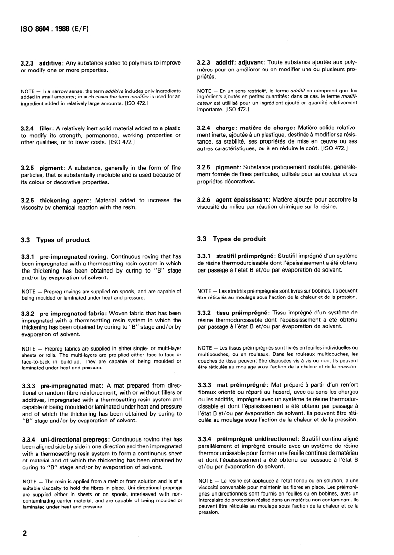 ISO 8604:1988 is an international, bilingual (English/French) standard that establishes a common vocabulary and symbol system for crosslinkable prepregs (pre-impregnated reinforcement and resin systems). Published as the first edition in 1988 and prepared by ISO/TC 61 (Plastics), the standard defines 36 terms and 25 letter symbols used in the designation, production and use of thermosetting prepregs.