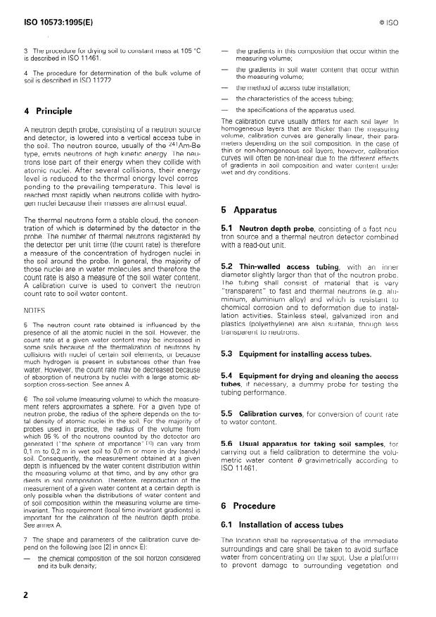Keywords: ISO 10573, soil quality, soil water content, unsaturated zone, neutron depth probe method, soil moisture profiling, in situ measurement, field calibration, volumetric water content, access tube, radiation safety.