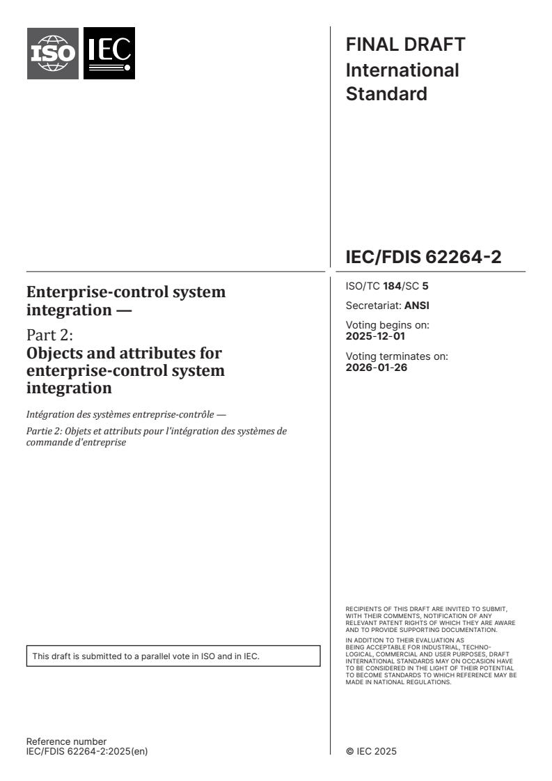 IEC/FDIS 62264-2 (ISO/TC 184/SC 5) defines the objects and attributes used for enterprise-control system integration between Level 3 manufacturing systems and Level 4 business systems. As a part of the IEC 62264 series, Part 2 focuses on a generic interface content model that enables consistent mapping of domain-specific standards and reduces risk, cost, and implementation errors. The draft is submitted for parallel vote (voting begins 2025-12-01 and terminates 2026-01-26).