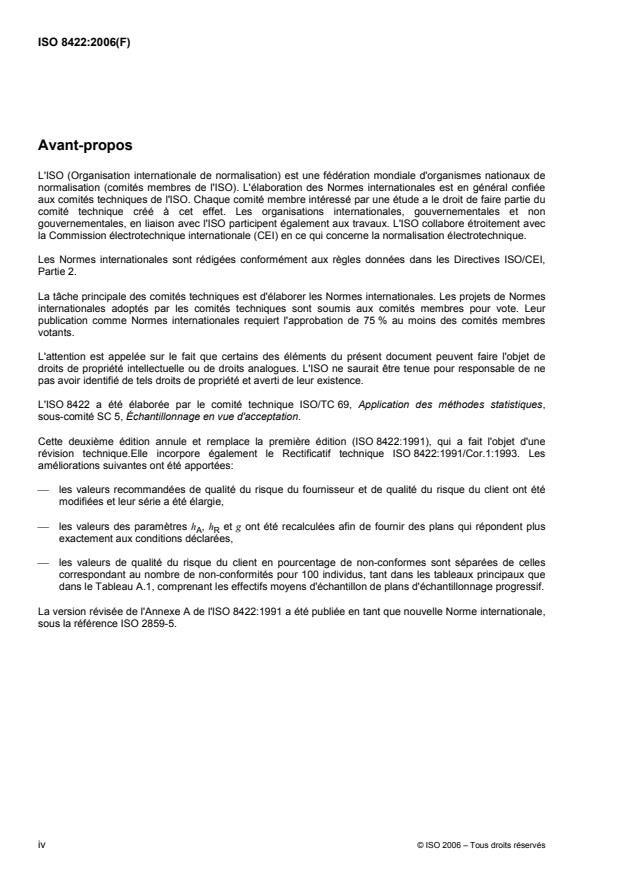 L'ISO 8422:2006 spécifie des plans et des règles d'échantillonnage progressif pour le contrôle par attributs d'individus discrets. Les plans sont indexés en termes de point du risque fournisseur et de point du risque client. Par conséquent, ils peuvent être utilisés pour l'échantillonnage pour acceptation mais également à des fins plus générales de vérification d'hypothèses statistiques simples concernant des proportions. L'ISO 8422:2006 fournit des règles, basées sur la détermination progressive des résultats de contrôle, pouvant être utilisées pour inciter le fournisseur, par des pressions économiques et psychologiques liées à la non-acceptation de lots de qualité inférieure, à fournir des lots de qualité ayant une forte probabilité d'acceptation. En même temps, le client est protégé par une limite supérieure imposée de la probabilité d'accepter des lots de faible qualité. L'ISO 8422:2006 fournit des plans d'échantillonnage applicables, d'une manière non limitative, notamment aux contrôles ci-après: produits finis, composants et matières premières, opérations, matériaux en cours de fabrication, fournitures en stock, opérations d'entretien, informations ou enregistrements, et procédures administratives. Il convient d'utiliser les plans d'échantillonnage de l'ISO 8422:2006 principalement pour l'analyse d'échantillons prélevés de processus. Par exemple, ils peuvent être utilisés pour l'échantillonnage pour acceptation de lots prélevés d'un processus sous maîtrise statistique. Par ailleurs, ils peuvent également être utilisés pour l'échantillonnage pour acceptation d'un lot isolé dont l'effectif est important et la proportion prévue de non-conformités est faible (sensiblement inférieure à 10 %). Dans le cas de l'échantillonnage pour acceptation d'une série continue de lots, il convient d'appliquer le système des plans d'échantillonnage progressif pour le contrôle lot par lot, indexés d'après le niveau de qualité acceptable (NQA) de l'ISO 2859-5.