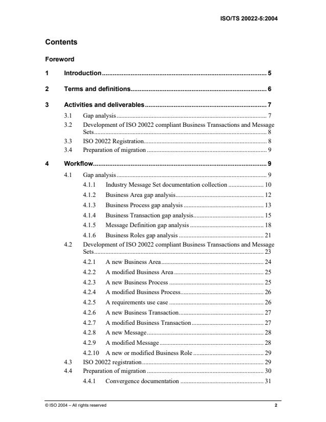 ISO/TS 20022-5:2004 describes the activities of "ISO 20022 reverse engineering" from the point of view of the user who wants to verify that the business functionality, covered by his own Industry Message Set, is covered by ISO 20022 compliant Business Transactions and Message Sets. It is not an attempt to define a"methodology" for reverse engineering. ISO/TS 20022-5:2004 describes the following set of required activities: extract relevant information from existing Industry Message Sets and compare it to the related information in the ISO 20022 Repository; use the results of this comparison for the development of ISO 20022 compliant Business Transactions and Message Sets; submit the resulting update requests to the Registration Authority; prepare the migration to the ISO 20022 compliant Business Transactions and Message Sets. The main objectives of the "ISO 20022 reverse engineering" are as follows: capture the industry knowledge covered by existing Industry Message Sets; build upon former standardization efforts in the industry when building ISO 20022 compliant Business Transactions and Message Sets; ensure that the resulting ISO 20022 compliant Business Transactions and Message Sets fully cover the business scope of existing Industry Message Sets; maximize interoperability between existing Industry Message Sets and ISO 20022 compliant Business Transactions and Message Sets; support the migration from existing Industry Message Sets to ISO 20022 compliant Business Transactions and Message Sets. ISO/TS 20022-5:2004 gives some specific terms that are used in the document. It then describes the major activities that will be conducted during reverse engineering and also describes at a high level the resulting deliverables. A detailed workflow is presented, explaining all activities, inputs and outputs. Finally, a detailed description of the Convergence Documentation is given in an appendix.