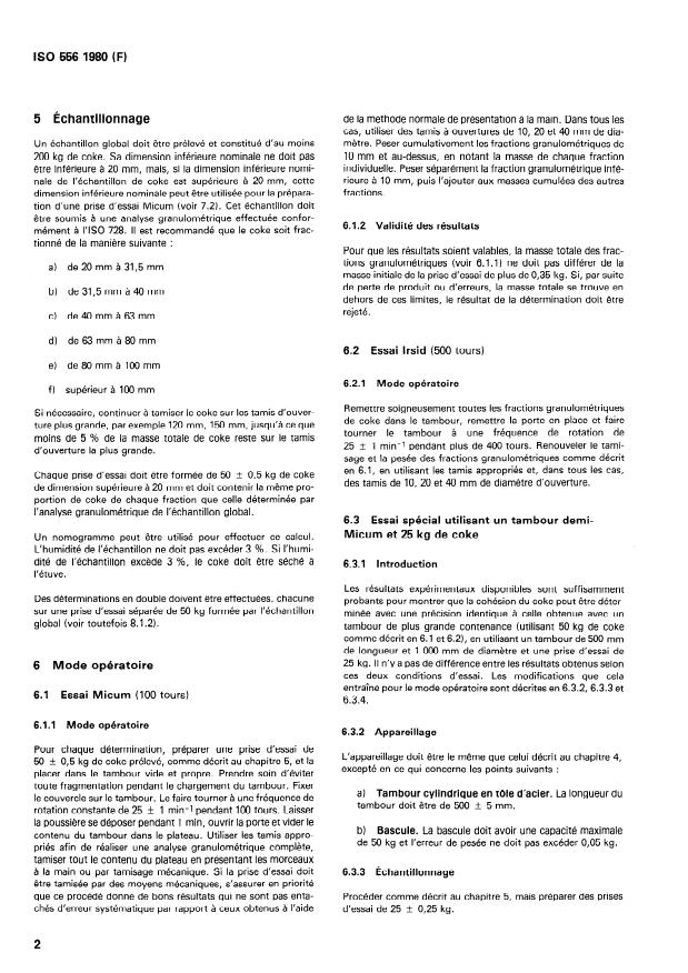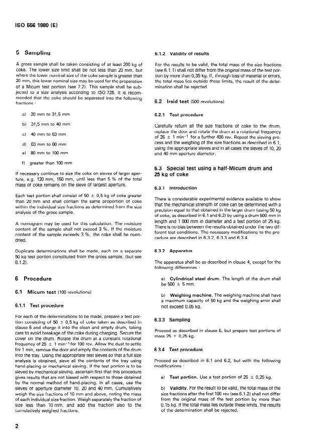 ISO 556:1980 is a standard published by the International Organization for Standardization (ISO). Its full title is "Coke (greater than 20 mm in size) — Determination of mechanical strength". This standard covers: A sample of coke greater than 20 mm in size and of known size distribution is subjected to mechanical stresses ina rotating drum. The degree of breakdown of the coke is evaluated by a process of sieving and size analysis after 100 drum revolutions (Micum test) and, if desired, after 500 drum revolutions (Irsid test).