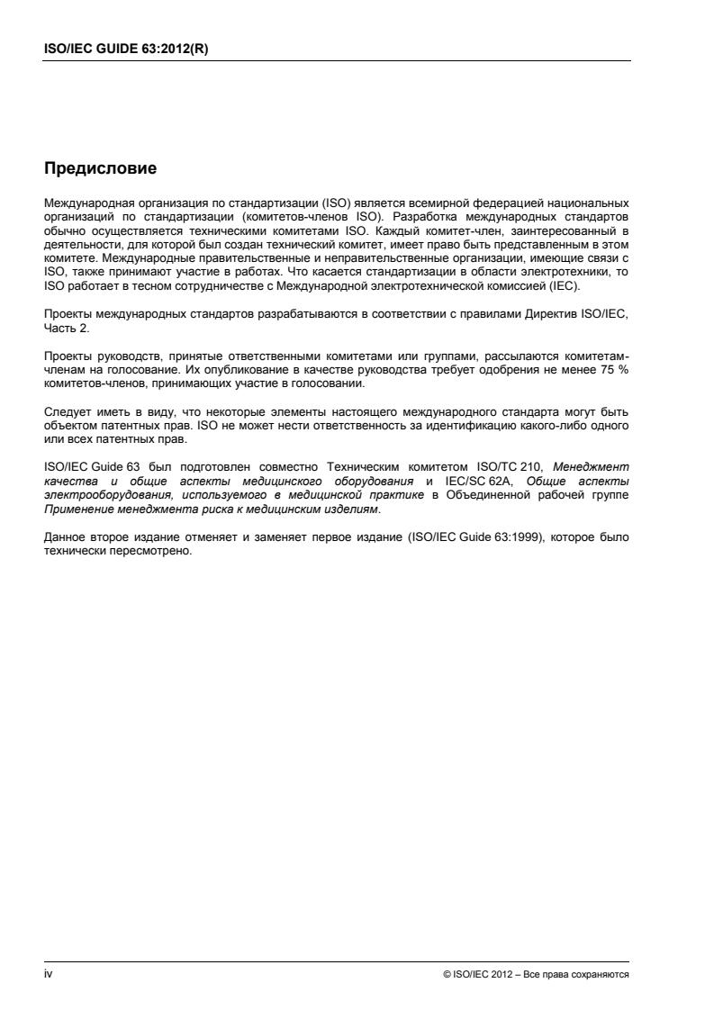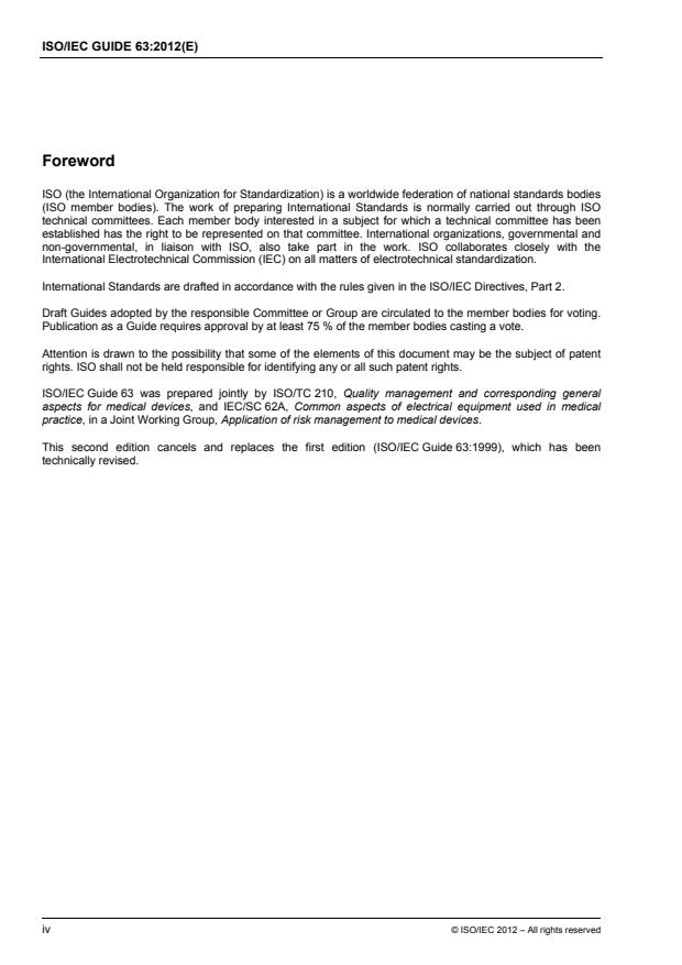 ISO/IEC Guide 63:2012 provides guidance to standards writers on how to include safety aspects in the development of medical device safety standards intended to be used within the risk management framework established in ISO 14971. It expands on the concepts developed in ISO/IEC Guide 51 to include safety-related performance and usability. ISO/IEC Guide 63:2012 is intended to be read in conjunction with ISO/IEC Guide 51 and ISO 14971.