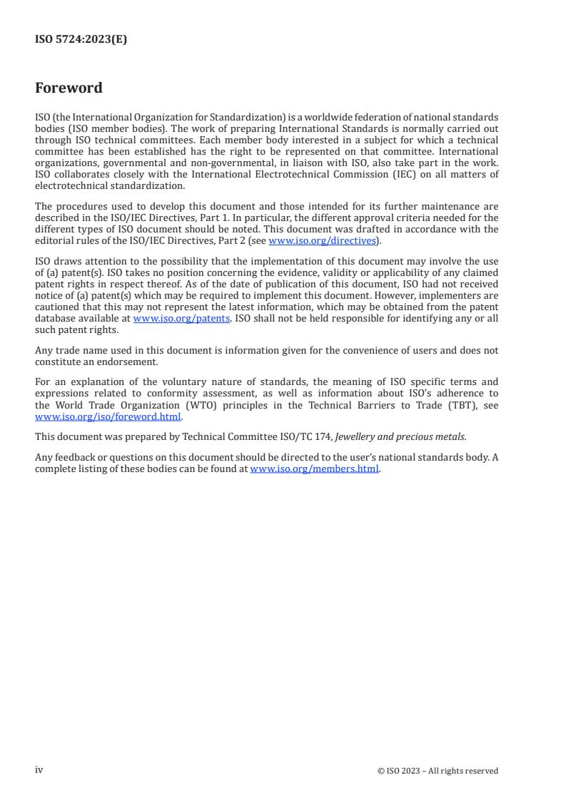 ISO 5724:2023 is a standard published by the International Organization for Standardization (ISO). Its full title is "Jewellery and precious metals - Determination of very high purity gold - Difference method using ICP-MS". This standard covers: This document specifies an analytical procedure for the determination of very high purity gold with a nominal content of and above 999,99 ‰ (parts per thousand, by mass), using an inductively coupled plasma mass spectrometer (ICP-MS).