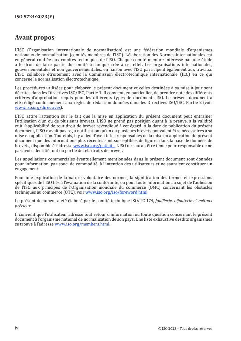 ISO 5724:2023 is a standard published by the International Organization for Standardization (ISO). Its full title is "Jewellery and precious metals — Determination of very high purity gold — Difference method using ICP-MS". This standard covers: This document specifies an analytical procedure for the determination of very high purity gold with a nominal content of and above 999,99 ‰ (parts per thousand, by mass), using an inductively coupled plasma mass spectrometer (ICP-MS).