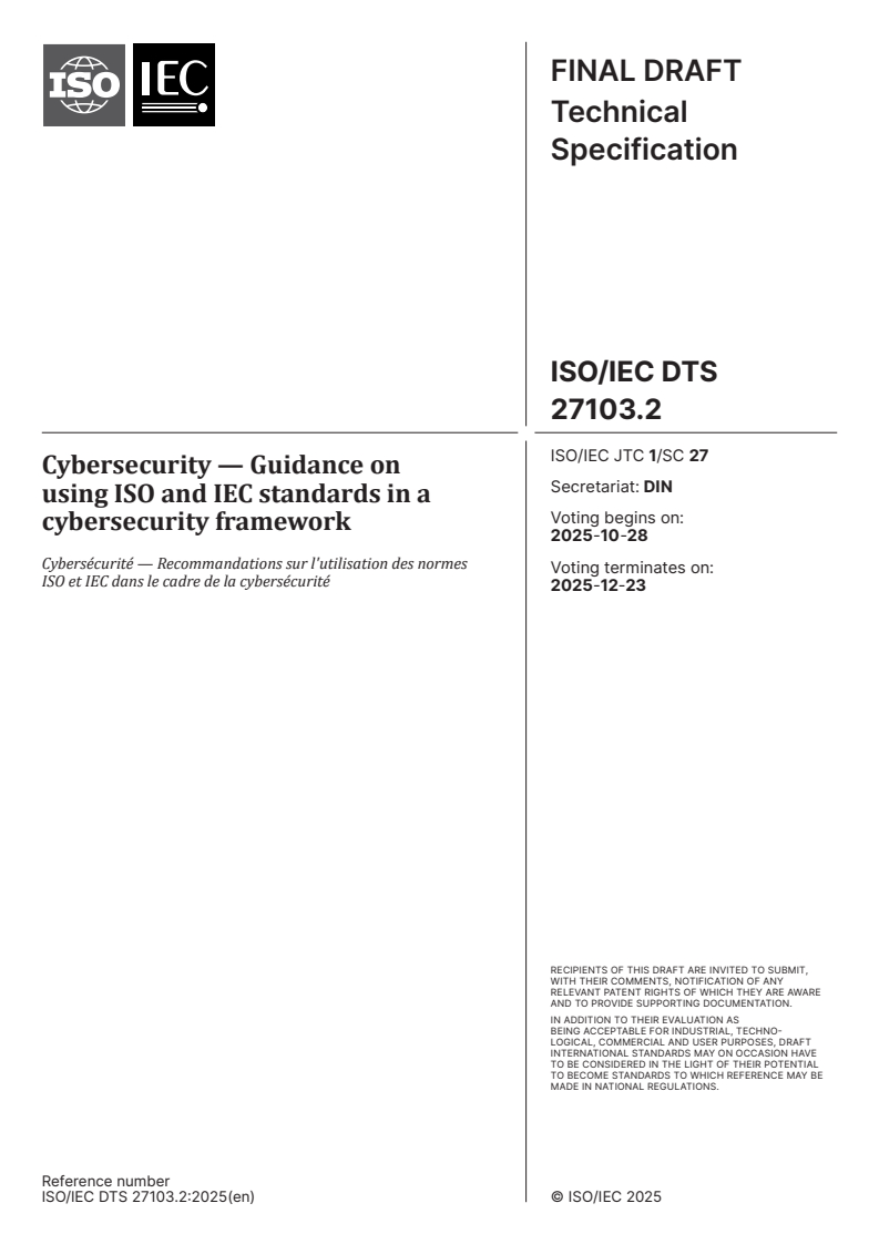 ISO/IEC DTS 27103.2 - Cybersecurity — Guidance on using ISO and IEC standards in a cybersecurity framework Released:10/14/2025