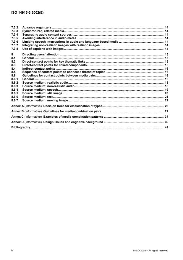 ISO 14915-3:2002 gives recommendations for, and guidance on, the design, selection and combination of interactive user interfaces that integrate and synchronize different media. It addresses user interfaces for applications that incorporate, integrate and synchronize different media. This includes static media such as text, graphics, images; and dynamic media such as audio, animation, video or media related to other sensory modalities. Detailed design issues within a single medium (e.g. the graphical design of an animation sequence) are only addressed as far as they imply ergonomic consequences for the user.