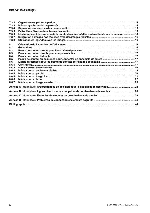 L'ISO 14915-3:2002 fournit des recommandations et sert de guide pour la conception, la sélection et la combinaison d'interfaces utilisateur qui intègrent et synchronisent différents médias. Elle traite des interfaces utilisateur pour des applications qui incorporent, intègrent et synchronisent différents médias. Ceci inclut les médias statiques tels que texte, graphique, image, et les médias dynamiques tels que son, animation, vidéo ou des médias liés à d'autres modalités sensorielles. Les sujets de conception détaillés pour un médium unique (par exemple la conception graphique d'une séquence d'animation) ne sont traités que dans la mesure où ils impliquent des conséquences ergonomiques pour l'utilisateur.