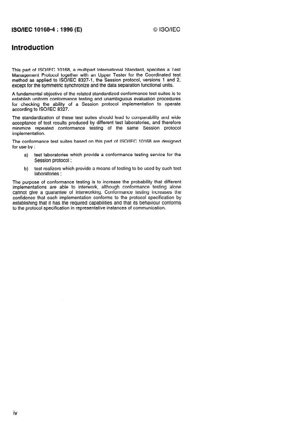 ISO/IEC 10168-4:1996 is a standard published by the International Organization for Standardization (ISO). Its full title is "Information technology — Open Systems Interconnection — Conformance test suite for the Session protocol — Part 4: Test management protocol specification". This standard covers: Defines procedures for a single protocol for the transfer of data and control information from one test management entity (the Lower Tester) to a peer test management entity (the Upper Tester) and the structure and encoding of the test management protocol data units used to operate the test management protocol.