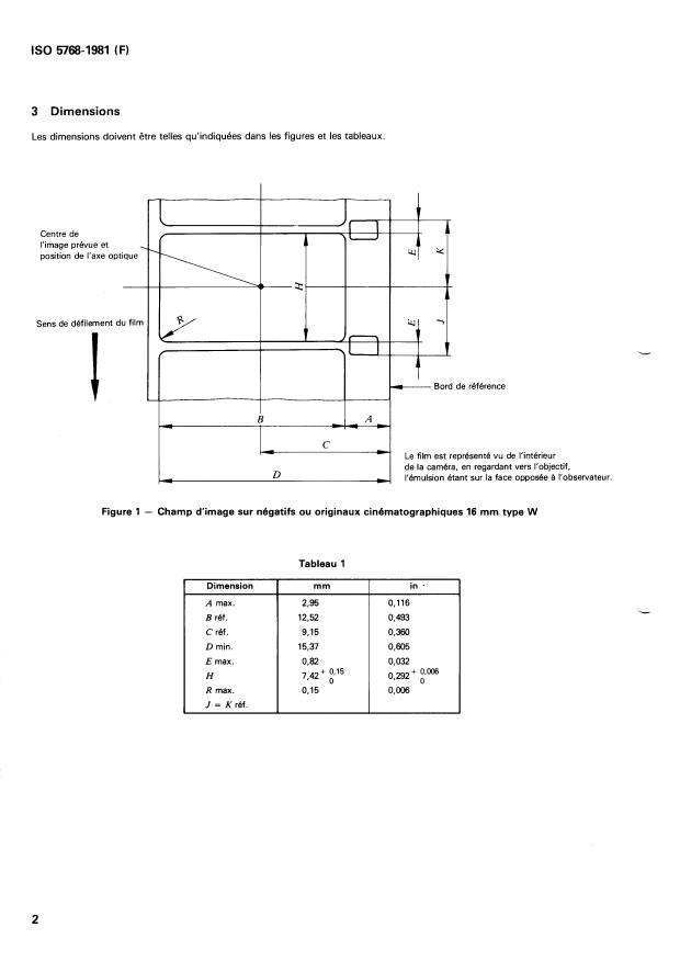 ISO 5768:1981 - Cinématographie -- Champ d'image enregistré par la caméra type W sur film cinématographique 16 mm -- Position et dimensions