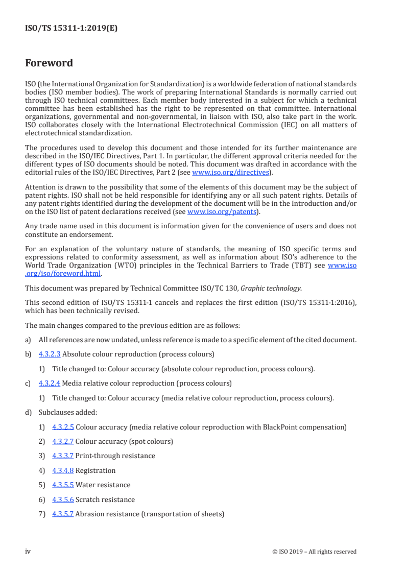 ISO/TS 15311-1:2019 is a technical specification published by the International Organization for Standardization (ISO). Its full title is "Graphic technology — Print quality requirements for printed matter — Part 1: Measurement methods and reporting schema". This standard covers: This document defines print quality metrics, measurement methods and reporting requirements for printed sheets that are suitable for all classes of printed products. Guidance as to which of these metrics to apply to any given product category along with acceptable conformance criteria is provided in subsequent parts of ISO/TS 15311. Although this document is expected to be used primarily to measure prints from digital printing systems, the metrics are general and may be applied to other kinds of print.