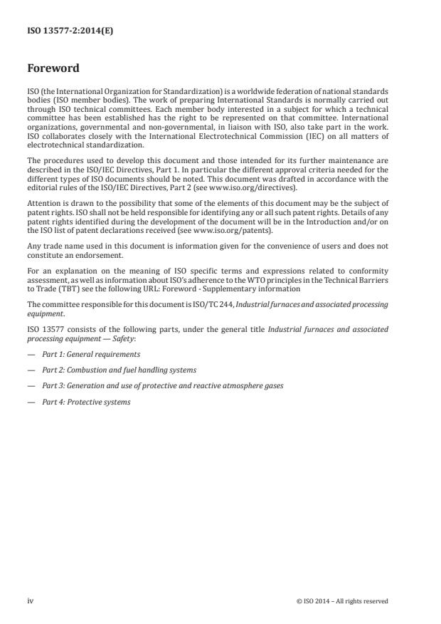 ISO 13577-2:2014 is a standard published by the International Organization for Standardization (ISO). Its full title is "Industrial furnaces and associated processing equipment — Safety — Part 2: Combustion and fuel handling systems". This standard covers: ISO 13577-2:2014 specifies the safety requirements for combustion and fuel handling systems that are part of industrial furnaces and associated processing equipment (TPE). It deals with significant hazards, hazardous situations and events relevant to combustion and fuel handling systems, when used as intended and under the conditions foreseen by the manufacturer. ISO 13577-2:2014 covers: fuel pipework downstream of and including the manual isolating valve; combustion air supply (including oxygen and oxygen enriched combustion air) and flue gas system; burner(s), burner system and ignition device; functional requirements for safety related control system. It applies to any oxidation with air or other gases containing free oxygen of gaseous and liquid fuels or any combustion of them to release thermal energy in TPE. For thermal or catalytic post combustion and waste incineration, ISO 13577-2:2014 applies only to auxiliary burners designed to start-up and/or support the process. ISO 13577-2:2014 also gives the necessary requirements regarding information for use.