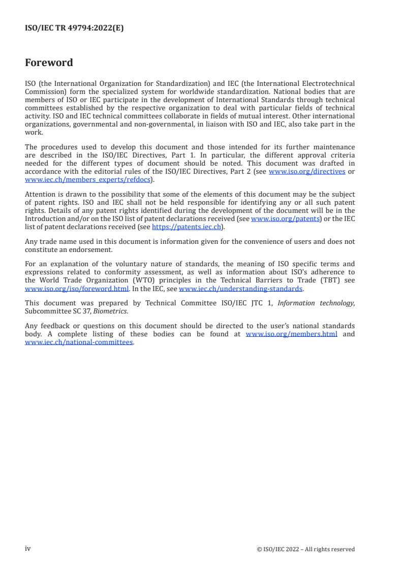 ISO/IEC TR 49794:2022 is a technical report published by the International Organization for Standardization (ISO). Its full title is "Information technology - Transition examples from the ISO/IEC 19794:2005 series to the ISO/IEC 39794 series for ID documents". This standard covers: This document provides transition examples from ISO/IEC 19794-4:2005 and ISO/IEC 19794-5:2005 formats to ISO/IEC 39794-4:2019 and ISO/IEC 39794-5:2019 formats for eMRTD application. This document also provides an implementation example for the ISO/IEC 39794-6:2021 format. This document includes: - information for eMRTD issuers and eMRTD-reader vendors; - summarized tables of data elements of ISO/IEC 19794-4:2005 and ISO/IEC 19794-5:2005 and ISO/IEC 39794-4:2019, ISO/IEC 39794-5:2019 and ISO/IEC 39794-6:2021; - correspondence tables of data elements between ISO/IEC 19794-4:2005 and ISO/IEC 19794-5:2005 and ISO/IEC 39794-4:2019 and ISO/IEC 39794-5:2019, providing: - information on whether each data element is normative or optional, and - a brief note of each data element from the viewpoint of transition; - tag, length, value (TLV) data examples of ISO/IEC 39794-4:2019, ISO/IEC 39794-5:2019 and ISO/IEC 39794-6:2021 for implementation, and, - tag lists of ISO/IEC 39794-4:2019, ISO/IEC 39794-5:2019 and ISO/IEC 39794-6:2021, and an extended example of ISO/IEC 39794-5 as informative annexes. The following are not within the scope of this document: - second and later editions of the ISO/IEC 19794 series (2011 and after), and, - ASN.1 formats and XML formats specified in the ISO/IEC 39794 series.