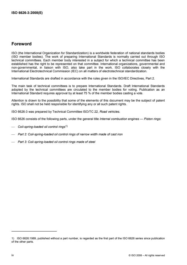 ISO 6626-3:2008 is a standard published by the International Organization for Standardization (ISO). Its full title is "Internal combustion engines — Piston rings — Part 3: Coil-spring-loaded oil control rings made of steel". This standard covers: ISO 6626-3:2008 specifies the essential dimensions of coil-spring-loaded, nitrided oil control rings made of steel, of piston ring types SOR (with R-shaped groove) and SOV (with V-shaped groove). ISO 6626-3:2008 applies to coil-spring-loaded, nitrided oil control rings made of steel with a diameter of between 60 mm and 200 mm inclusive for reciprocating internal combustion engines. It can also be used for piston rings of compressors working under analogous conditions.
