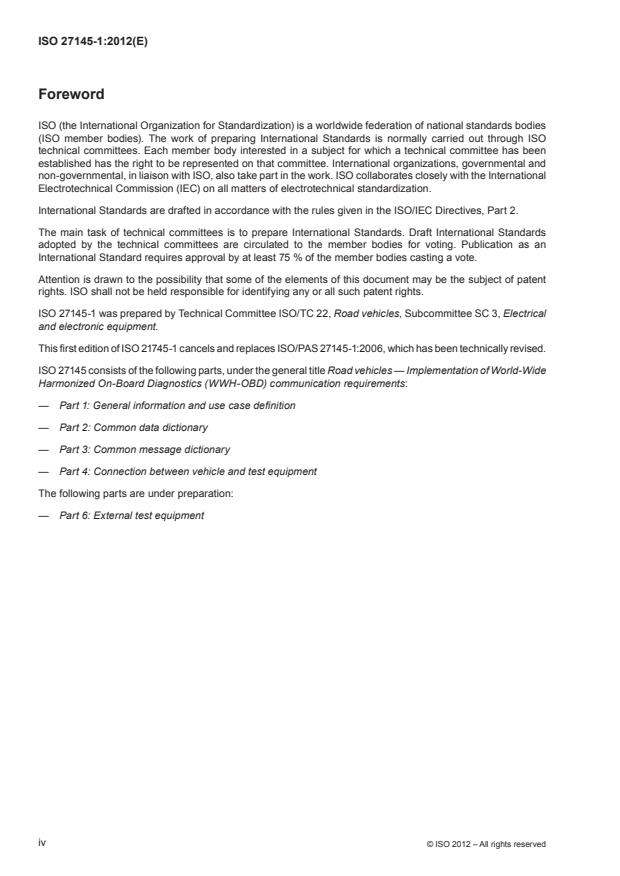 ISO 27145-1:2012 - "Road vehicles - Implementation of World‑Wide Harmonized On‑Board Diagnostics (WWH‑OBD) communication requirements - Part 1: General information and use case definition" is the introductory part of the ISO 27145 series. It provides the structure, terminology and high‑level use case definitions for implementing a world‑wide harmonized OBD communication standard (WWH‑OBD). The document explains the relationship between the parts of ISO 27145, the intended migration path from CAN‑based diagnostics (DoCAN) to Ethernet/IP‑based diagnostics (DoIP), and how external test equipment initializes and identifies supported protocols and diagnostic services for emissions‑related systems.