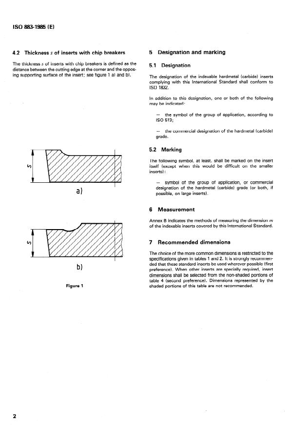 ISO 883:1985 is a standard published by the International Organization for Standardization (ISO). Its full title is "Indexable hardmetal (carbide) inserts with rounded corners, without fixing hole — Dimensions". This standard covers: La présente Norme internationale fixe les dimensions des plaquettes amovibles en métaux-durs (carbures métalliques) avec arrondi de pointe, sans trou de fixation et à dépouille de 0° et 11°. Ces plaquettes sont principalement destinées à être fixées mécaniquement, par bride, sur des outils de tournage et d'alésage.