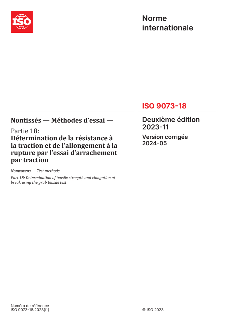 ISO 9073-18:2023 - Nontissés — Méthodes d’essai — Partie 18: Détermination de la résistance à la traction et de l’allongement à la rupture par l’essai d’arrachement par traction Released:17. 11. 2023