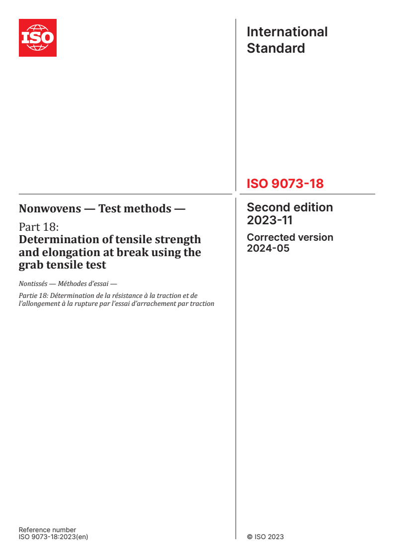 ISO 9073-18:2023 - Nonwovens — Test methods — Part 18: Determination of tensile strength and elongation at break using the grab tensile test Released:5/15/2024