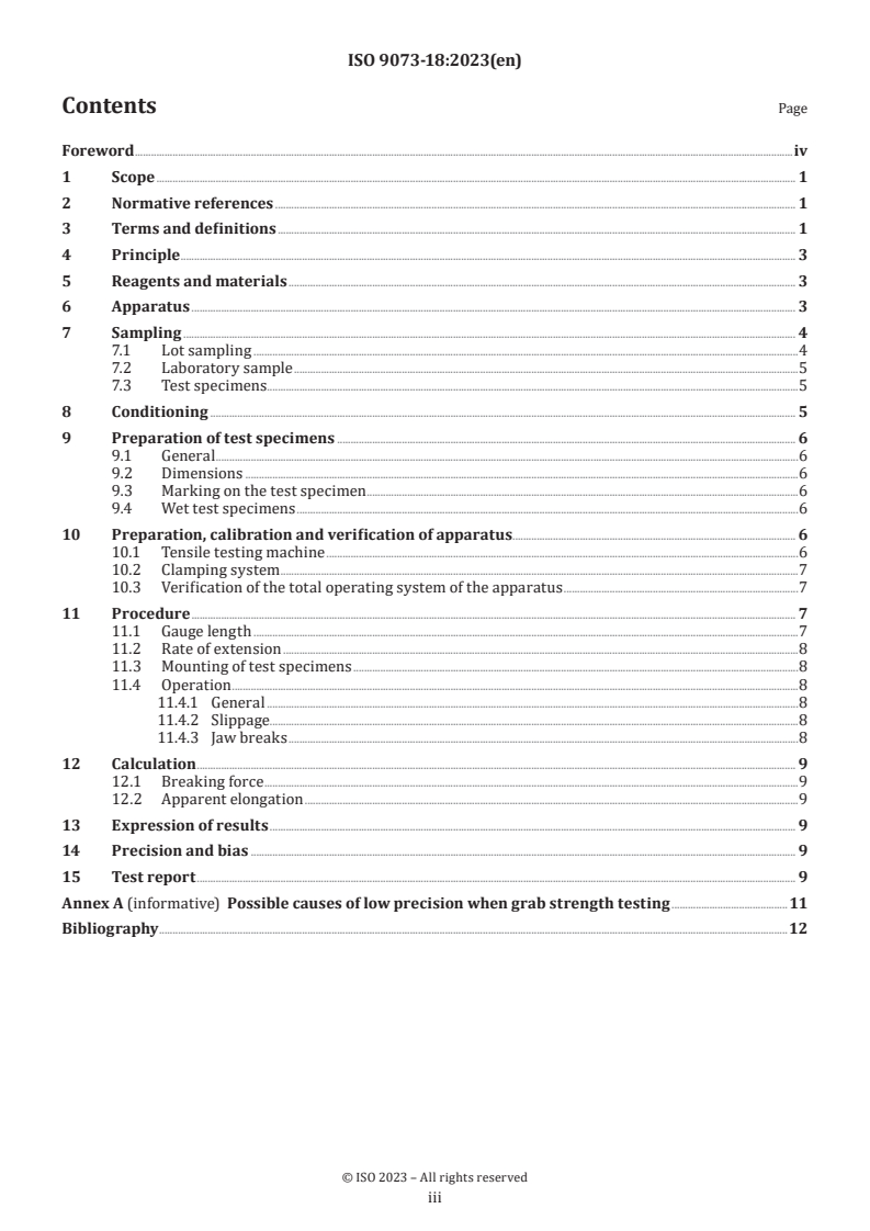 - Procedures for calculating breaking force and apparent elongation, expression of results, and clauses on precision and bias are included.