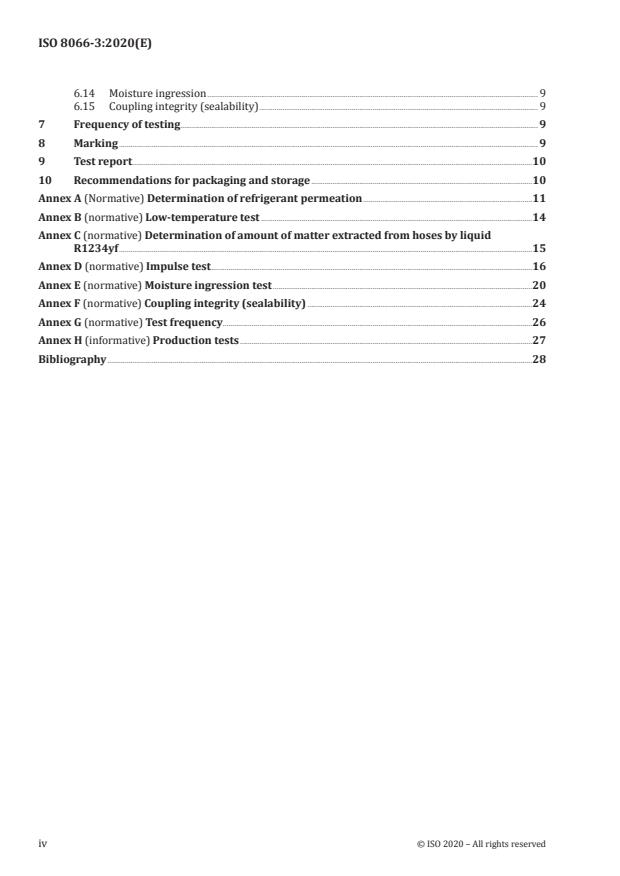 - Normative annexes detail methods for permeation, low‑temperature testing, extraction, impulse testing, moisture ingression, coupling sealability, and test frequency.