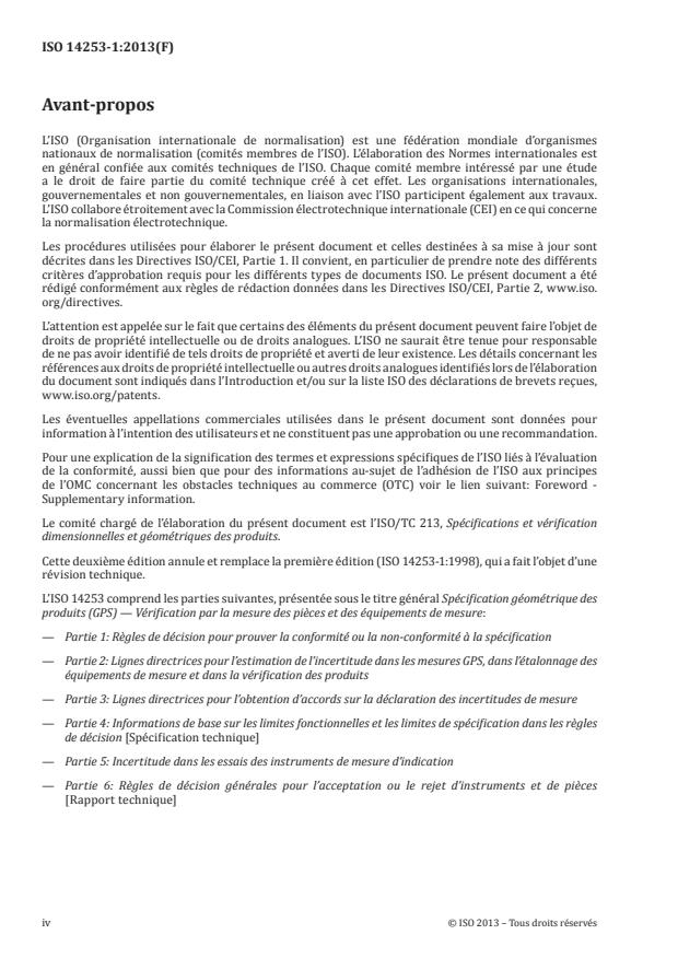 L'ISO 14253-1:2013 établit les règles permettant de déterminer la conformité ou la non-conformité à une tolérance donnée pour une caractéristique d'une pièce (ou une population de pièces) ou aux limites des erreurs maximales tolérées pour une caractéristique métrologique d'un équipement de mesure, en prenant en compte l'incertitude de mesure. Ces règles sont différentes pour des tolérances de pièces individuelles et des tolérences de populations de pièces. Elle donne aussi des règles pour les cas où une décision claire (conformité ou non-conformité à la spécification) ne peut pas être prise, c'est-à-dire lorsque le résultat de mesure se trouve dans la plage d'incertitude qui se situe autour des limites de spécification. L'ISO 14253-1:2013 est applicable aux spécifications définies dans les normes générales GPS (voir l'ISO/TR 14638), c'est-à-dire les normes élaborées par l'ISO/TC 213, comprenant - les spécifications des pièces/populations de pièces (généralement exprimées sous forme de limites de tolérance), et - les spécifications des équipements de mesure (généralement exprimées sous forme d'erreurs maximales tolérées). L'ISO 14253-1:2013 s'applique uniquement aux caractéristiques exprimées sous forme de valeurs numériques. L'ISO 14253-1:2013 ne s'applique pas à la vérification utilisant des calibres à limites. La vérification avec calibres à limites est couverte par l'ISO 1938-1.