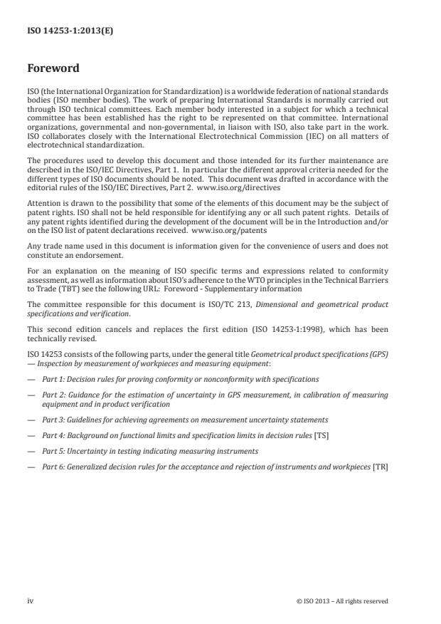 ISO 14253-1:2013 is a standard published by the International Organization for Standardization (ISO). Its full title is "Geometrical product specifications (GPS) — Inspection by measurement of workpieces and measuring equipment — Part 1: Decision rules for proving conformity or nonconformity with specifications". This standard covers: ISO 14253-1:2013 establishes the rules for determining the conformity or nonconformity with a given tolerance for a characteristic of a workpiece (or a population of workpieces) or limits of maximum permissible errors for a metrological characteristic of a measuring equipment, taking into account the measurement uncertainty. These rules are different for tolerances to individual workpieces and tolerances to workpiece populations. It also gives rules on how to deal with cases where a clear decision (conformity or nonconformity with specification) cannot be taken, i.e. when the measurement result falls within the uncertainty range that exists around the specification limits. ISO 14253-1:2013 applies to specifications defined in general GPS standards (see ISO/TR 14538), i.e. standards prepared by ISO/TC 213, including: ? workpiece/population of workpieces specifications (usually given as an upper tolerance limit or a lower tolerance limit or both), and; ? measuring equipment specifications (usually given as maximum permissible errors). ISO 14253-1:2013 only applies for characteristics expressed as numerical quantity values.