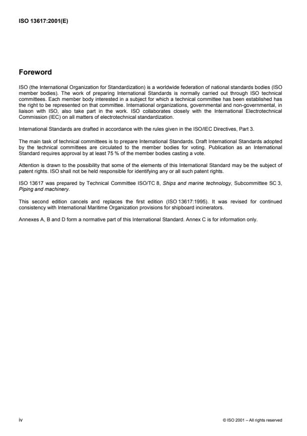 ISO 13617:2001 is a standard published by the International Organization for Standardization (ISO). Its full title is "Ships and marine technology — Shipboard incinerators — Requirements". This standard covers: Ships and marine technology — Shipboard incinerators — Requirements
