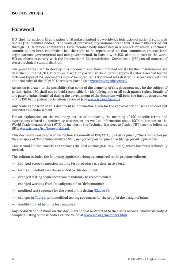 ISO 7432:2018 is a standard published by the International Organization for Standardization (ISO). Its full title is "Glass-reinforced thermosetting plastics (GRP) pipes and fittings — Test methods to prove the design of locked socket-and-spigot joints, including double-socket joints, with elastomeric seals". This standard covers: This document specifies methods of test for joints with a locked socket and spigot, including double-socket joints, and with elastomeric seals, for buried and above ground glass-reinforced thermosetting plastics (GRP) piping systems. It covers methods of test for leaktightness and resistance to damage of the joint only, when subjected to specified combinations of angular movement, compression (deformation) perpendicular to the pipe axis and internal pressure. It assumes that the joint will be exposed to the effects of hydrostatic end thrust. This document is applicable to joints for either pressure or non-pressure applications. The tests are suitable for the evaluation of joints intended for applications in which the liquids are conveyed at temperatures specified in the referring standards. The joints tested in accordance with this document are subjected to conditions which measure their ability to function and thereby prove the design of the joint, especially for type test purposes. The joint is only qualified according to the test sequences and configurations detailed in this document. With the exception of the bending test (see 9.5), the test procedures are applicable to joints for pipes and fittings of all nominal sizes. If not otherwise agreed between the manufacturer and the customer, the bending test detailed in 9.5 is applicable to joints with pipes and fittings up to and including DN 600. The test procedures in this document are damaging to the test piece, which will not be suitable for reuse after these tests. The test procedure is intended to be applied for type testing purposes. This document is applicable only to the joint and specifies methods of test to prove its design.