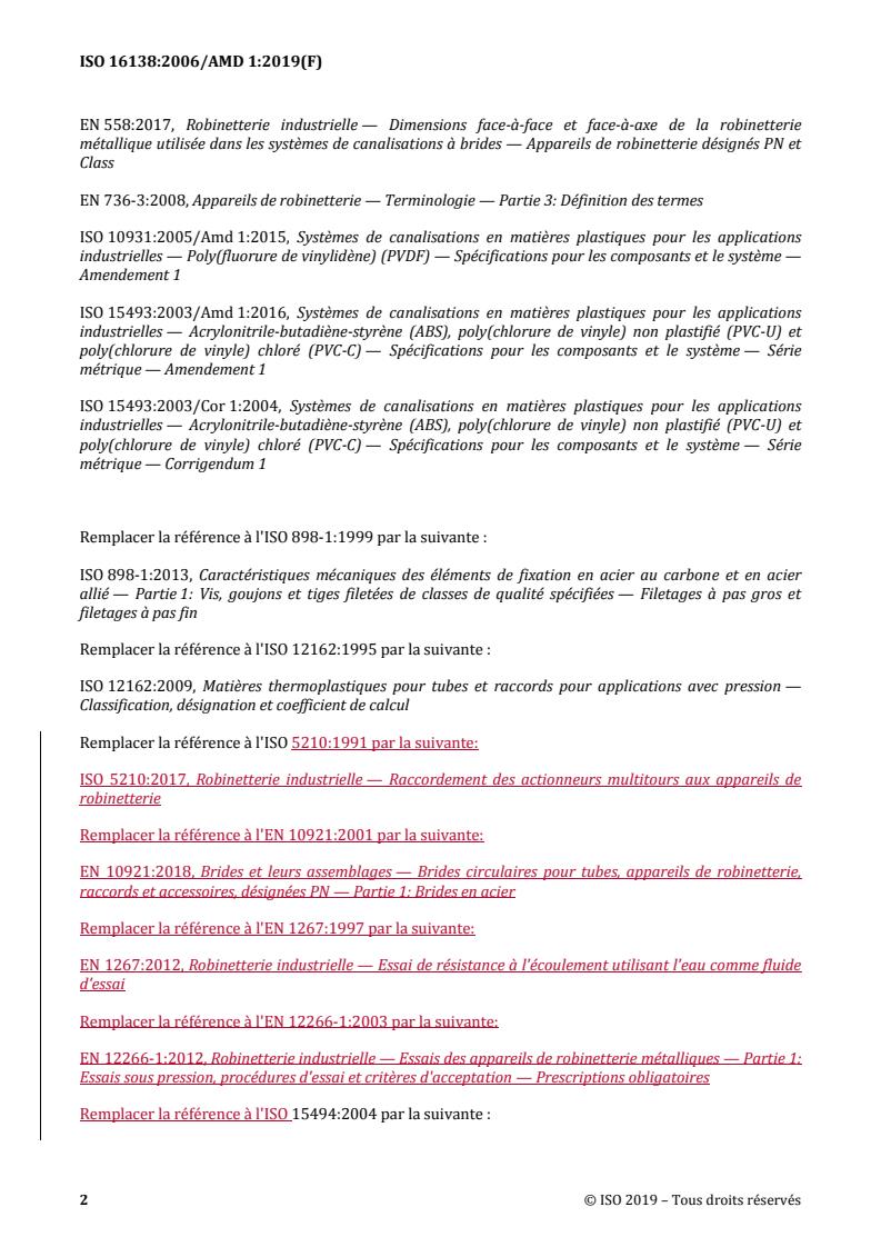 References and Terminology: The amendment updates a variety of normative references, replacing outdated standards with current versions covering pipe threads, industrial valve dimensions, mechanical fasteners, and plastics piping systems. Notes and terminology are harmonized with IEC Electropedia and ISO Online Browsing Platform resources to support consistent interpretation.